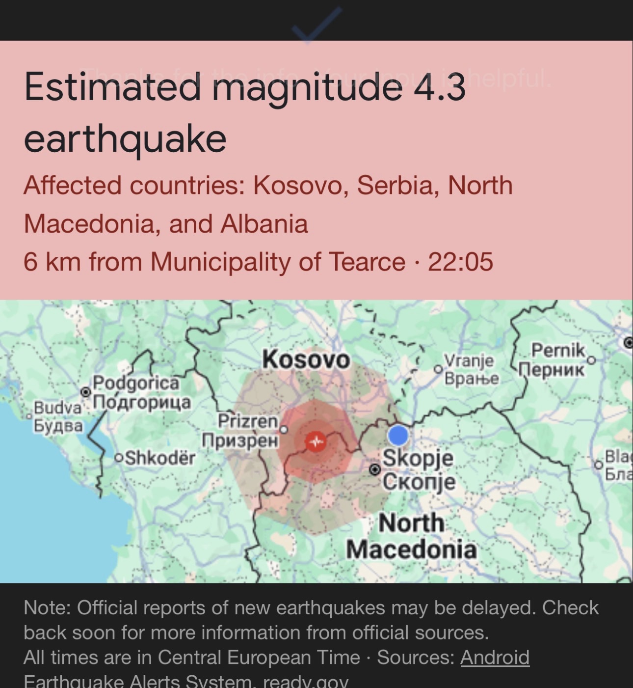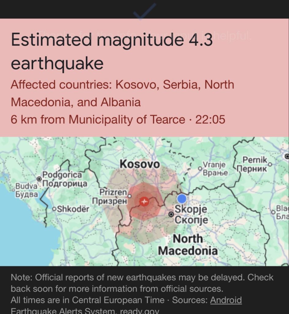 Një tërmet me magnitudë 4,6 ballë të shkallës Rihter ka goditur Maqedoninë e Veriut dhe Kosovën, sipas të dhënave të publikuara nga Qendra Sizmologjike Evropiano-Mesdhetare (EMSC).
